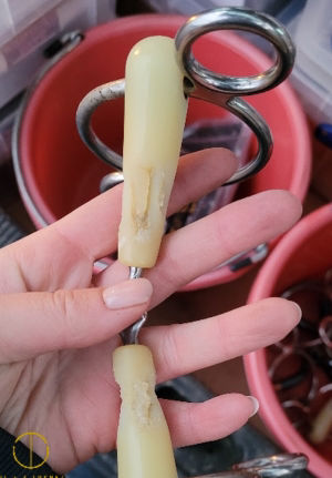 This plastic bit has been chewed, creating very sharp edges that cut the horses tongue and bars.