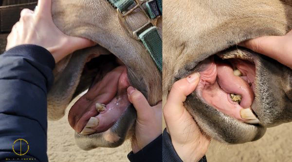 This horse has scarring and cuts on the inside of its fleshy lips where a loose ring bit was too small.