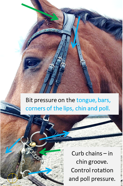 The pressure created by a bit encourages the horse to offer the behaviour or movement required by the rider. The rider applies a certain amount of force through the reins and this travels through to the bit which can then act on different areas of the mouth and jaw including the lips, bars, tongue, hard palate, chin, and poll depending on the type of bit being used.