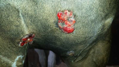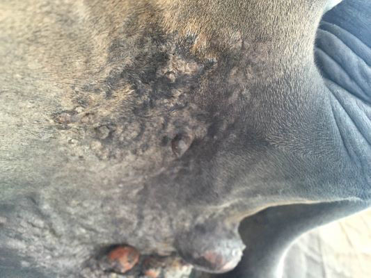These tumours are invasive and can invade down into the tissues underneath the horse's skin. As they grow rapidly, they are usually ulcerated and will bleed when traumatised. These sarcoids tend to grow in clusters and have an irregular appearance.