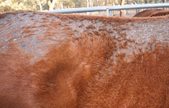 This skin issue commonly presents as scabs and hair loss along the horse’s neck, back and hindquarters but can also develop on their legs if they spend long periods of time standing in wet conditions.