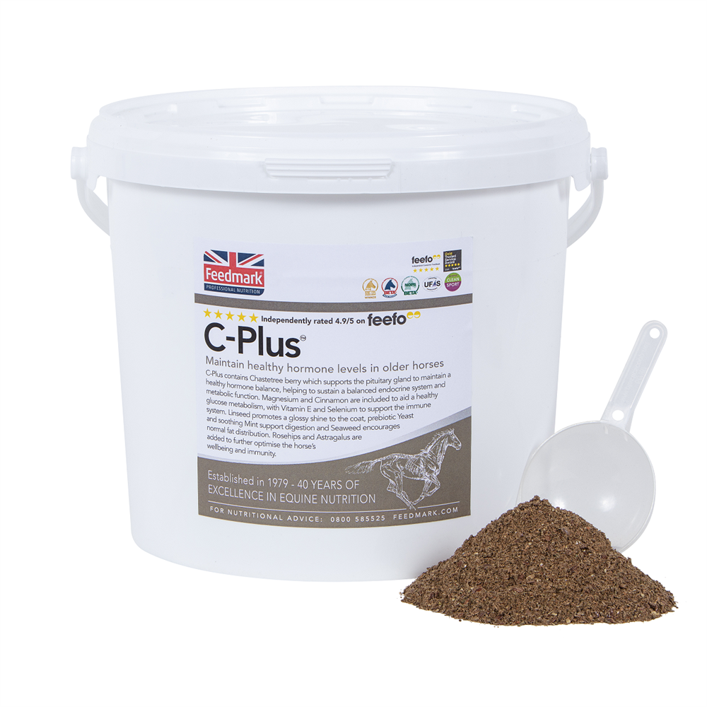 C-Plus™ nagyszerű kiegészítője minden ló étrendjének. A terméket úgy alakítottuk ki, hogy támogassa a hormon egyensúlytalanságban szenvedő lovakat és pónikat. A benne található barátcserje elősegíti a vedlést, és a ragyogó nyári szőrzetet, míg a fahéj, a tengeri moszat és a magnézium támogatja a megfelelő anyagcserét. A sörélesztő biotint biztosít, és segíti a vastagbél működését, míg a csipkebogyó magas C-vitamin tartalmának köszönhetően támogatja az immunrendszert. Mindezek az összetevők kombinálódnak lenmaggal, mely esszenciális zsírsavak forrása, és elengedhetetlen az erős patákhoz, az egészséges bőrhöz és a fényes szőrzethez. Nem utolsó sorban a lenmag rendkíül ízletes is, így még a válogatós lovakat is evésre ösztönzi.